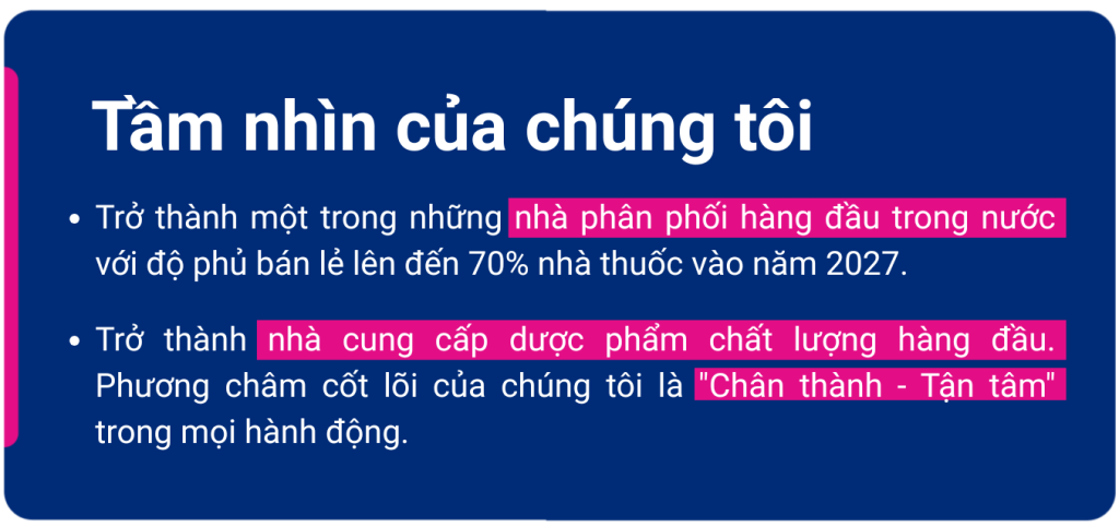 Được thành lập vào năm 2008 với gần 20 năm trên chặng đường hoạt động và phát triển trong ngành dược phẩm. Chúng tôi cam kết mang đến cho bạn cơ hội kinh doanh hiệu quả, đồng hành nâng cao sức khỏe cộng đồng thông qua các sản phẩm dược chất lượng và dịch vụ phân phối chuyên nghiệp.
