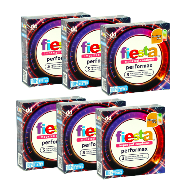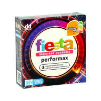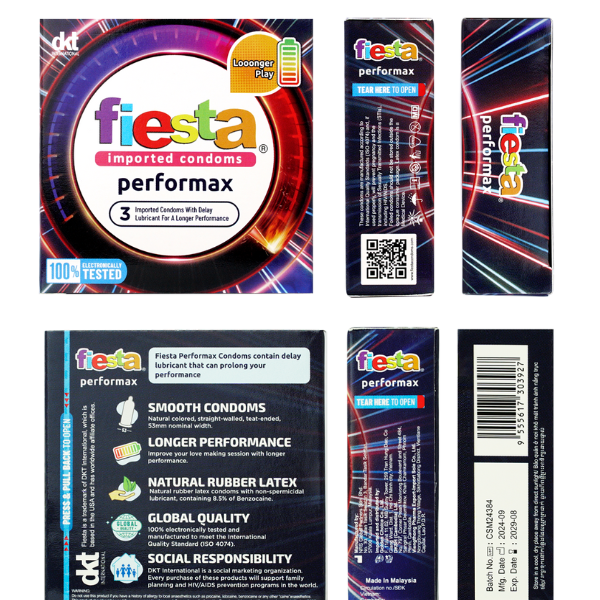 Fiesta Performax với chất bôi trơn chứa Benzocaine 8.5% đặc biệt giúp trì hoãn cực khoái, kéo dài thời gian yêu, tăng cường sức bền nhưng vẫn giữ trọn vẹn cảm giác tự nhiên. Thiết kế ôm vừa vặn, hương hoa nhài quyến rũ cùng chất liệu 100% latex thiên nhiên siêu mượt, giúp bạn luôn tự tin, làm chủ từng nhịp yêu đầy đam mê