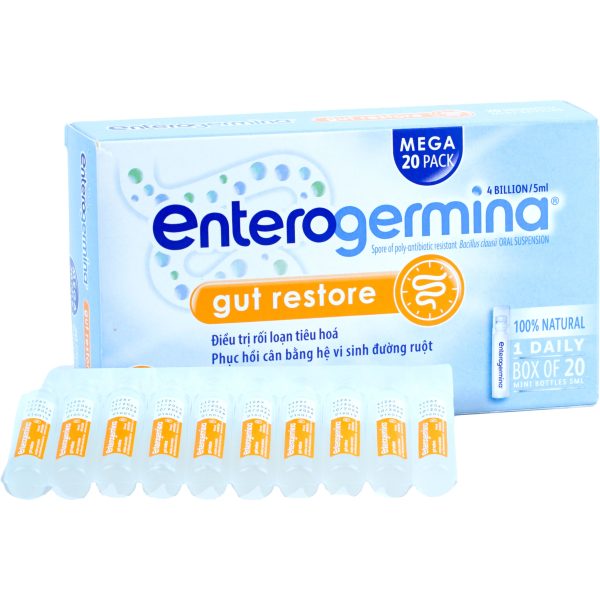 Enterogermina® Gut Restore cung cấp hàng tỷ bào tử lợi khuẩn giúp phục hồi hệ vi sinh đường ruột, điều trị hiệu quả các triệu chứng rối loạn tiêu hóa và tiêu chảy và tăng cường miễn dịch toàn diện cho mọi lứa tuổi.